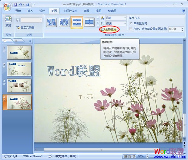 设置好一种切换效果后,我们只需单击“全部应用”按钮,即可将这中效果应用到所有的幻灯片中!